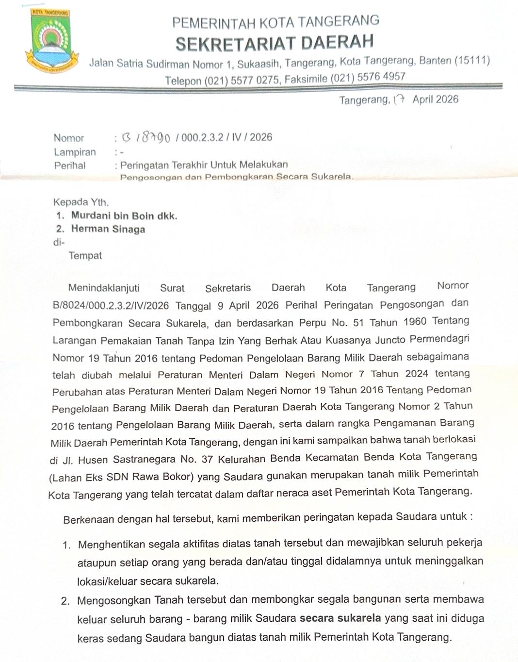 TANGERANG, Radarkriminaltv.com – Nafas lega warga di sekitar Jalan Husen Sastranegara, Benda, seketika sesak. Sebuah surat peringatan berkode **318790/000.2.3.2 / IV/2026** mendarat di tangan H. Murdani bin Boin pada Jumat (17/4/26), memerintahkannya angkat kaki dalam waktu singkat dari lahan yang telah ia tempati selama hampir seperempat abad. Kasus ini menjadi potret terbaru benturan antara klaim aset negara dan hak penguasaan fisik tanah oleh warga sipil.
