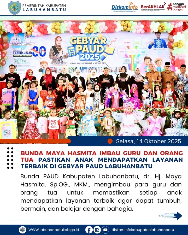 Hal tersebut disampaikan Bunda Maya Hasmita saat membuka Gebyar PAUD dalam rangka memperingati Hari Jadi ke-80 Kabupaten Labuhanbatu, yang digelar di Asrama Haji Rantauprapat, Kelurahan Ujung Bandar, Kecamatan Rantau Selatan, Selasa (14/10).
