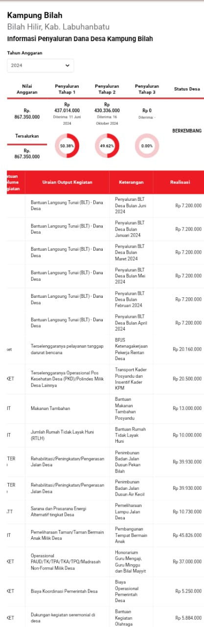 Total dari penyaluran satu priode ADD (Alokasi Dana Desa) tahun 2024 sebesar Rp. 291.410.000. Di tambah pengakuan dari bendahara bahwa ada silpa sebesar Rp. 120.000.000. Akan tetapi pagu dana desa Kampung Bilah satu priode tahun 2024 sebesar Rp. 867.350.000. Berarti sebesar Rp. 575.940.000. Yang harus di pertanyaan kemana arahnya dan Rekening Kas Desa (RKD) untuk silpa harus di transparansikan kepada publik sebagai mana yang tertuang dalam UU No 14 tahun 2008 tentang Keterbukaan Informasi Publik (KIP) ,dimana menjamin setiap orang untuk memperoleh informasi dari badan publik.