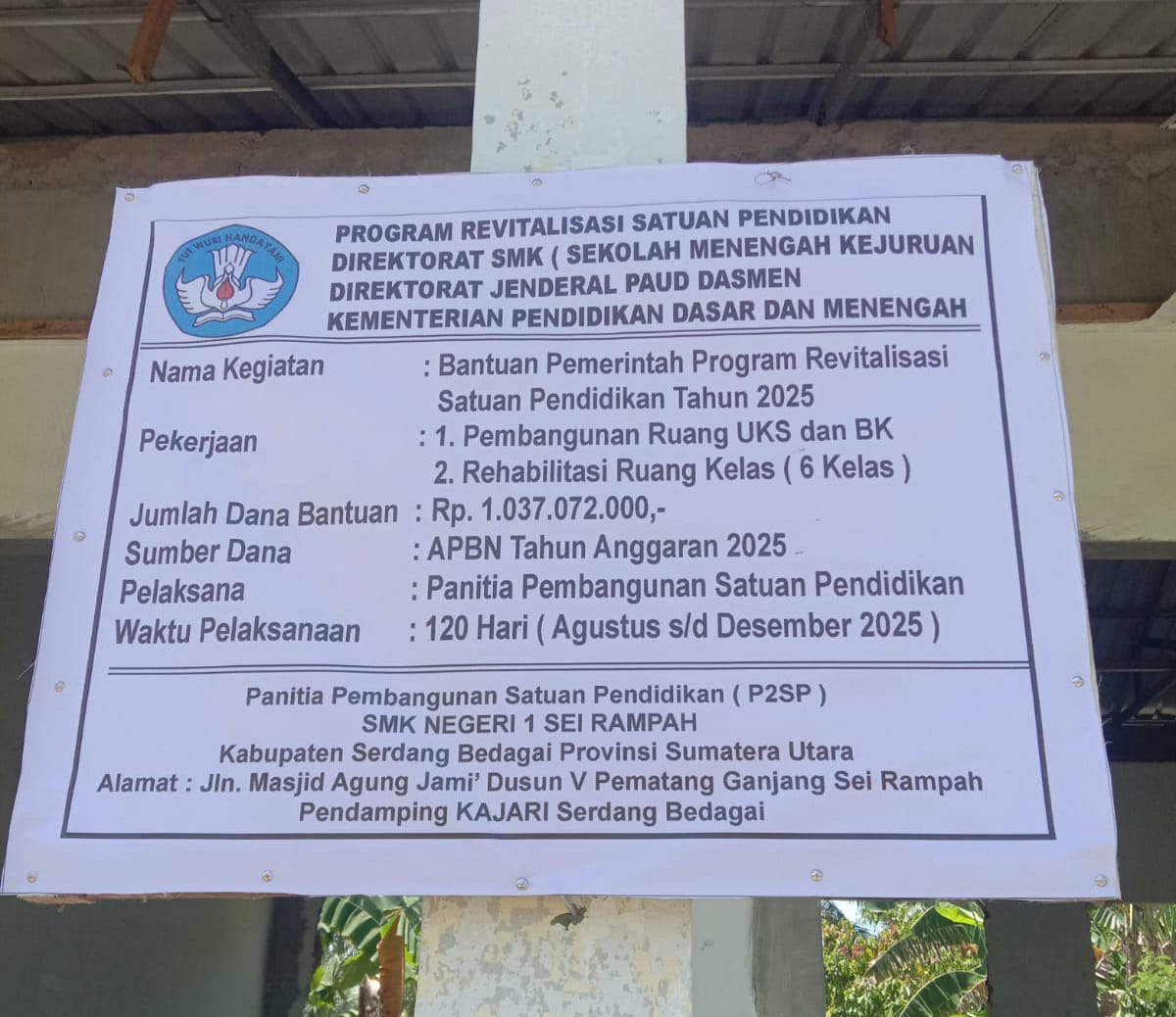 Sei Rampah | Radarkriminaltv.com – Diduga akan mudah di Korupsi,!!! Dana bantuan dari pemerintah program revitalisasi 1.M. Rehab Sekolah SMKN 1 Dusun 5 Pematang ganjang Desa Sei Rampah Serge-Senin 25/08/2025 pembangunan serta revitalisasi dan rehabilitasi sekolah dengan sumber dana yang di peroleh dari APBN tahun anggaran 2025 program yang sudah di canang oleh pemerintahan Bapak Presiden H. Prabowo Subianto untuk menunjang kesejahteraan para murid dan guru untuk belajar dan mengajar di seluruh pelosok negri Negara kesatuan republik indonesia dan itu langsung di perintahkan oleh bapak presiden H.Prabowo Subianto melalui pembantunya di kementrian pendidikan.