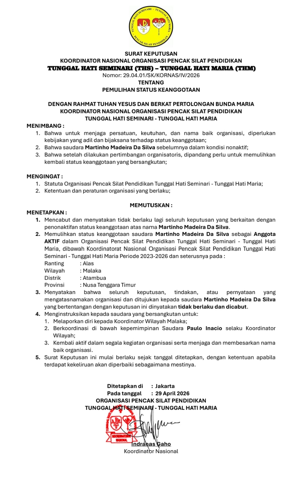 JAKARTA, Radarkriminaltv.com – Sebuah kabar menyejukkan menyelimuti keluarga besar Organisasi Pencak Silat Pendidikan Tunggal Hati Seminari – Tunggal Hati Maria (THS-THM). Melalui Surat Keputusan Nomor: 29.04.01/SK/KORNAS/IV/2026, Koordinator Nasional secara resmi mengumumkan pemulihan status keanggotaan saudara Martinho Madeira Da Silva.