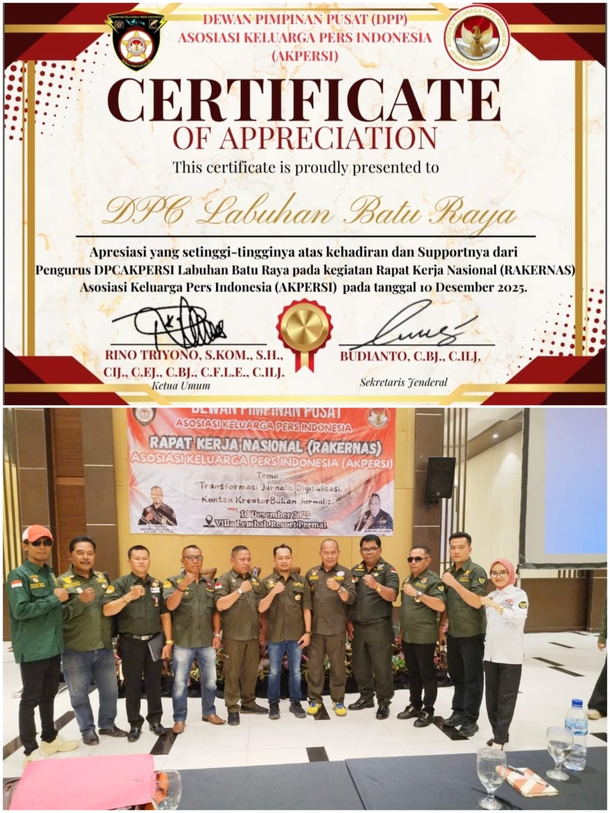 Sertifikat akreditasi tersebut diserahkan langsung oleh Ketua DPP Akpersi Rino Triyono, S.Kom., S.H., C.IJ., C.BJ., C.EJ., C.F.L.E. kepada Ketua DPC Labuhanbatu Raya, Bapak Zainal Arifin Lase, C.BJ., C.EJ. sebagai pengakuan atas komitmen dan kontribusi Asosiasi Keluarga Pers Indonesia (AKPERSI) Labuhanbatu Raya dalam meningkatkan kualitas dan profesionalisme jurnalis di Labuhanbatu raya.
