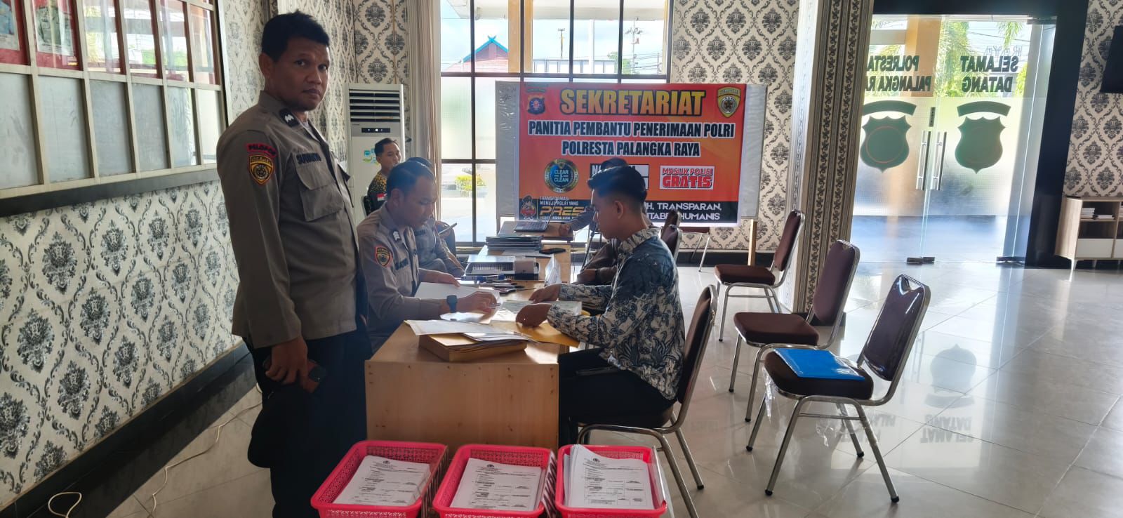 Selama pelaksanaan kegiatan, personel Bag SDM Polresta Palangka Raya memberikan pelayanan verifikasi berkas kepada para pendaftar guna memastikan kelengkapan administrasi sesuai ketentuan yang berlaku ( Niko Alda)